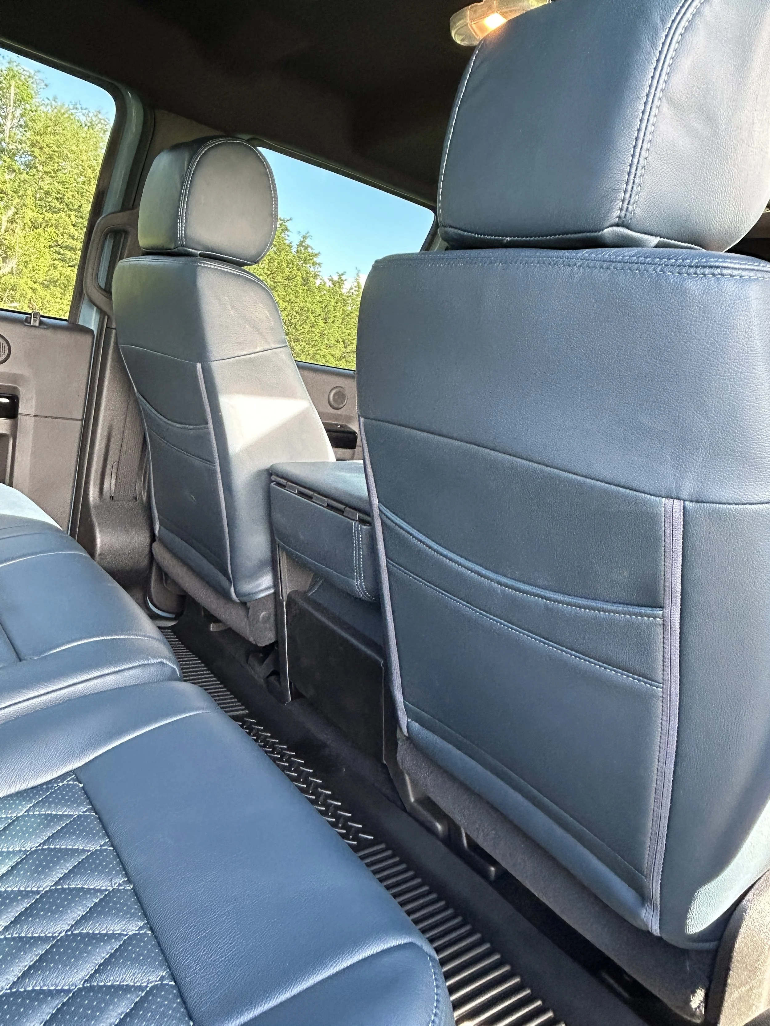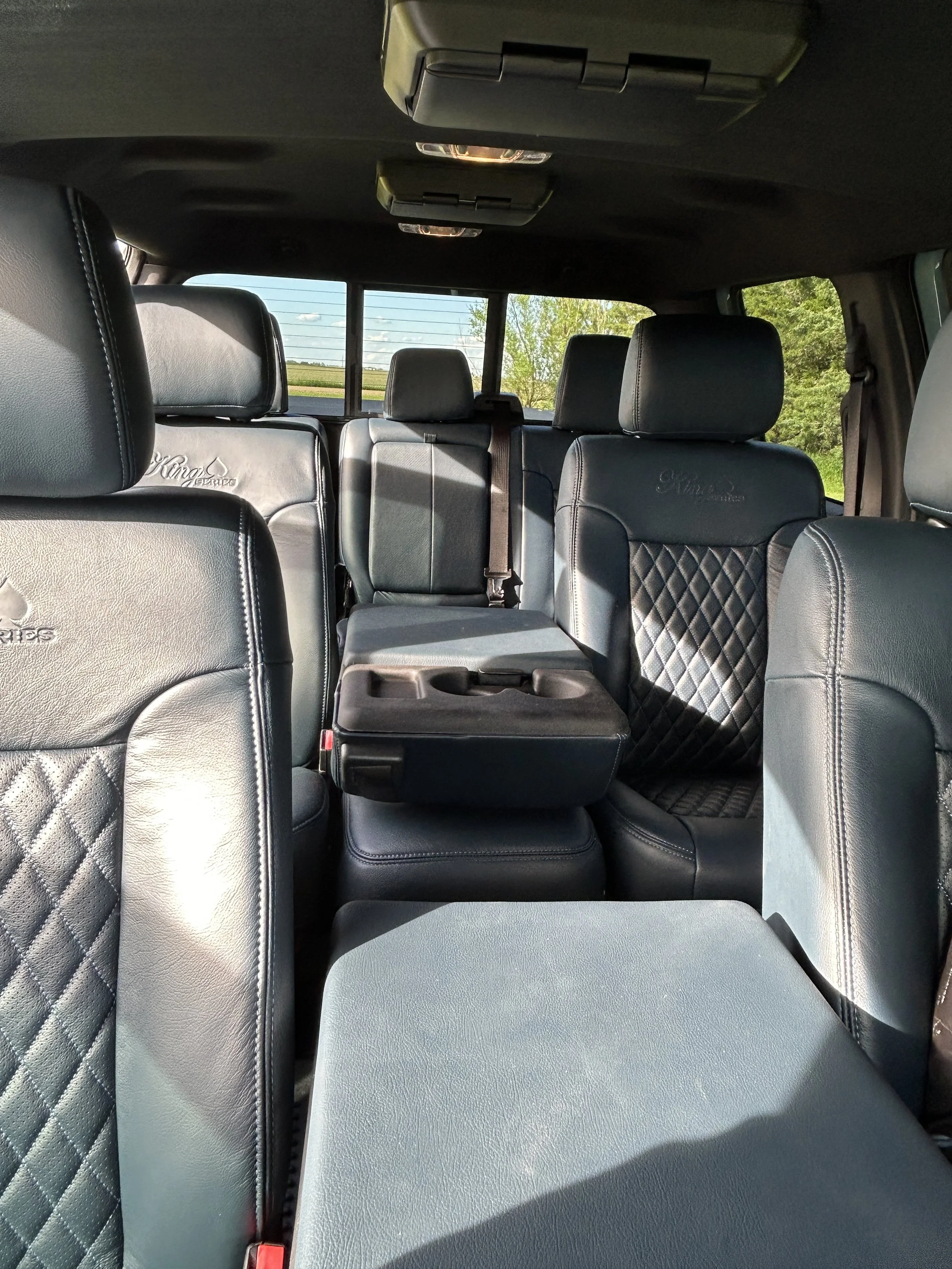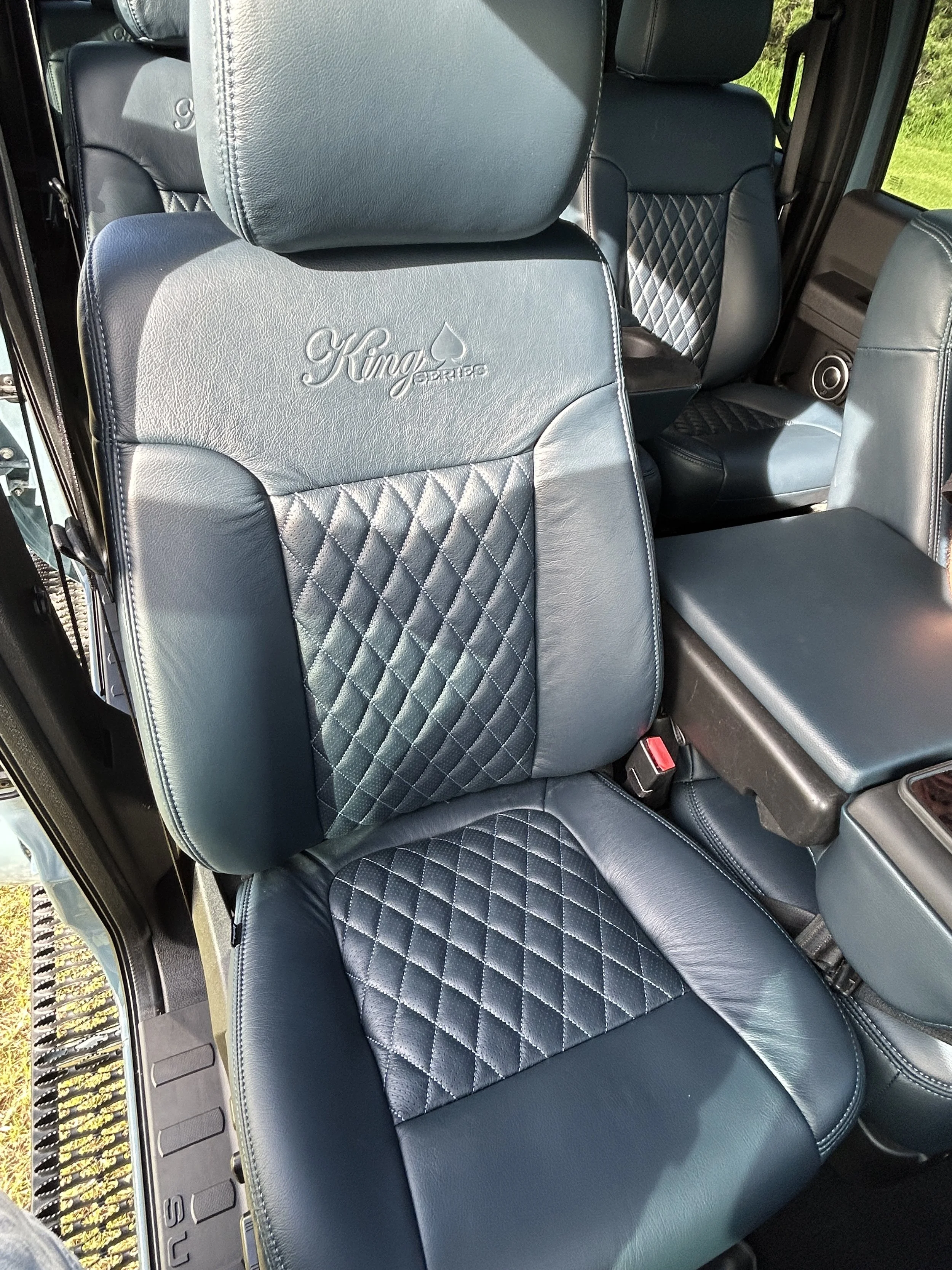 A color you’ve most definitely seen on the roads lately has finally made its way to our shop, Area 51 blue is here! This flat blue is accented so nicely with black handles, bumpers, wheels, smoked lights, and tires but these custom Katzkin leather upholstery seats in single-tone Atlantic with diamond stitch are in a league of their own! This one not only looks good, but sounds good with a new upgraded speaker system, and rides even better with rear Air Lift air ride suspension and Firestone Coil-Rite front air springs! The suspension sits perfect with the 3 1/2” ReadyLift and 35” tires. It’s hot in Texas so rear HVAC is a must while the kids watch their favorite movies on the added dual DVD players. Other upgrades include: TruXedo Sentry CT locking aluminum tonneau cover. Train Horn. Jimmi Jammers. Floor liners. Standard features include: LizardSkin spray-on Ceramic Insulation and Sound Control. Mil+Spec Liner in the box. Bilstein B8 shock absorbers. 2 Interstate Batteries. Dual port USB-C sockets. Seats 9. 4x4. 6.7L diesel. Warranty included. Top notch conversion with seamless fabrication! Learn more and see our other conversions at www.kingseriespickup.com. Contact us today at 605-550-9002 or at kingseriespickup@gmail.com to inquire! You can also contact us below on the link!