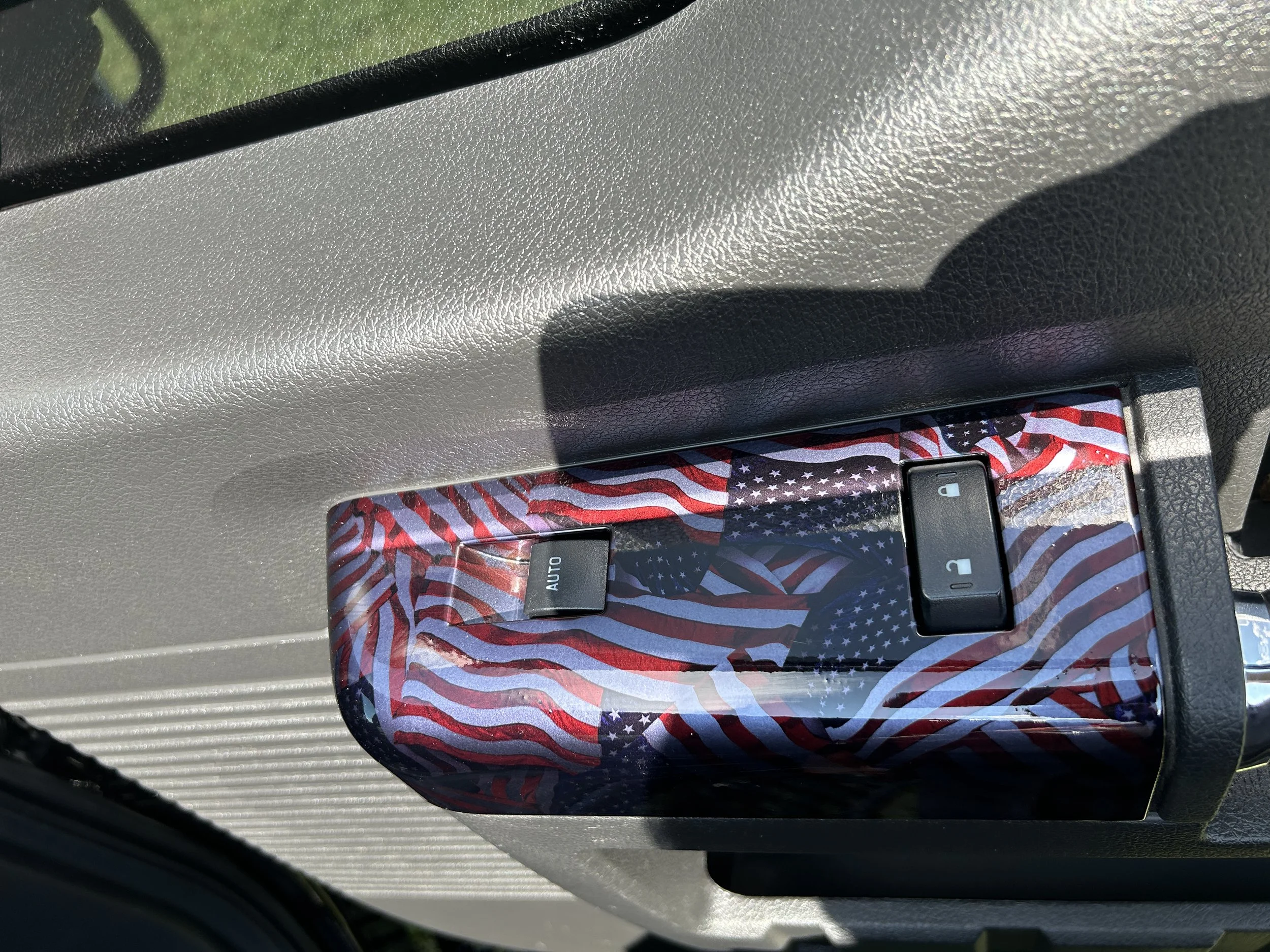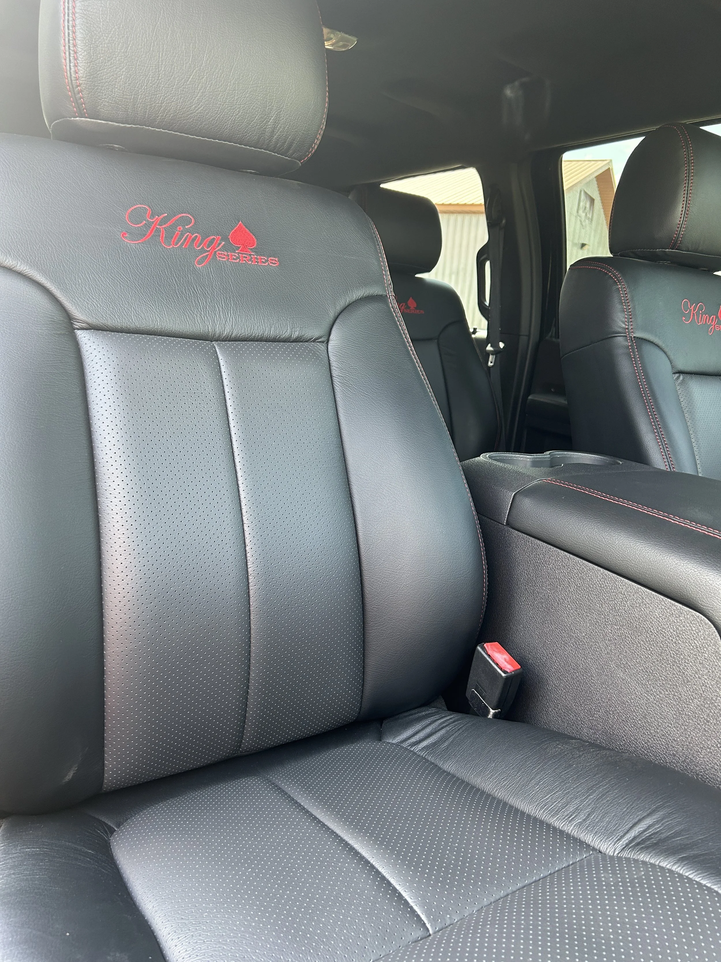 This 2016 F-250 is blacked out - literally! Tuxedo Black exterior paint with a Mil+Spec Liner bedlined roof, black textured door handles, and smoked out lighting matches the dark interior theme of a Black Wrap, Dark Graphite two tone combo, with a red stitch custom Katzkin leather upholstery. This truck has the 3 1/2” ReadyLift and 35” tires for just the right amount of lift. They’ve added heated seats throughout along with the rear HVAC unit and a single DVD player to make the most comfortable ride pulling the ice shack during those brutal midwest winters. Newly featured on this truck is our custom Eagle grille insert from our King Series custom accessory line which is seated nicely behind a full grille guard integrated into our King Series bumpers. The patriotic accents continue into the interior where the bezels are hydro-dipped in a cool flag film and top coated with a black candy paint. Other upgrades include: AirLift Rear air ride, Truexdo SentryCT Tonneau Cover, WeBoost, Interior Floor Lighting, VisionX LED Bed Lighting, VisionX LED lighting at door openings, 5 gallon air tank with upgraded compressor, custom fit floor liners. Standard features include: LizardSkin spray-on Ceramic Insulation and Sound Control. Bilstein B8 shock absorbers. Mil+Spec Liner in the box. 2 Interstate Batteries. Dual port USB sockets. Seats 8. 4x4. 6.7L diesel. Warranty included. Top notch conversion with seamless fabrication! Learn more and see our other conversions at www.kingseriespickup.com. Contact us today at 605-550-9002 or at kingseriespickup@gmail.com to inquire! You can also contact us below on the link!