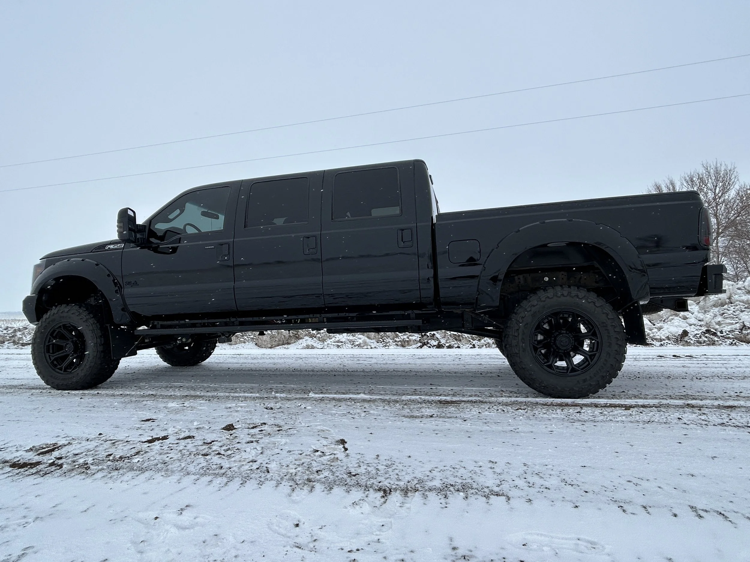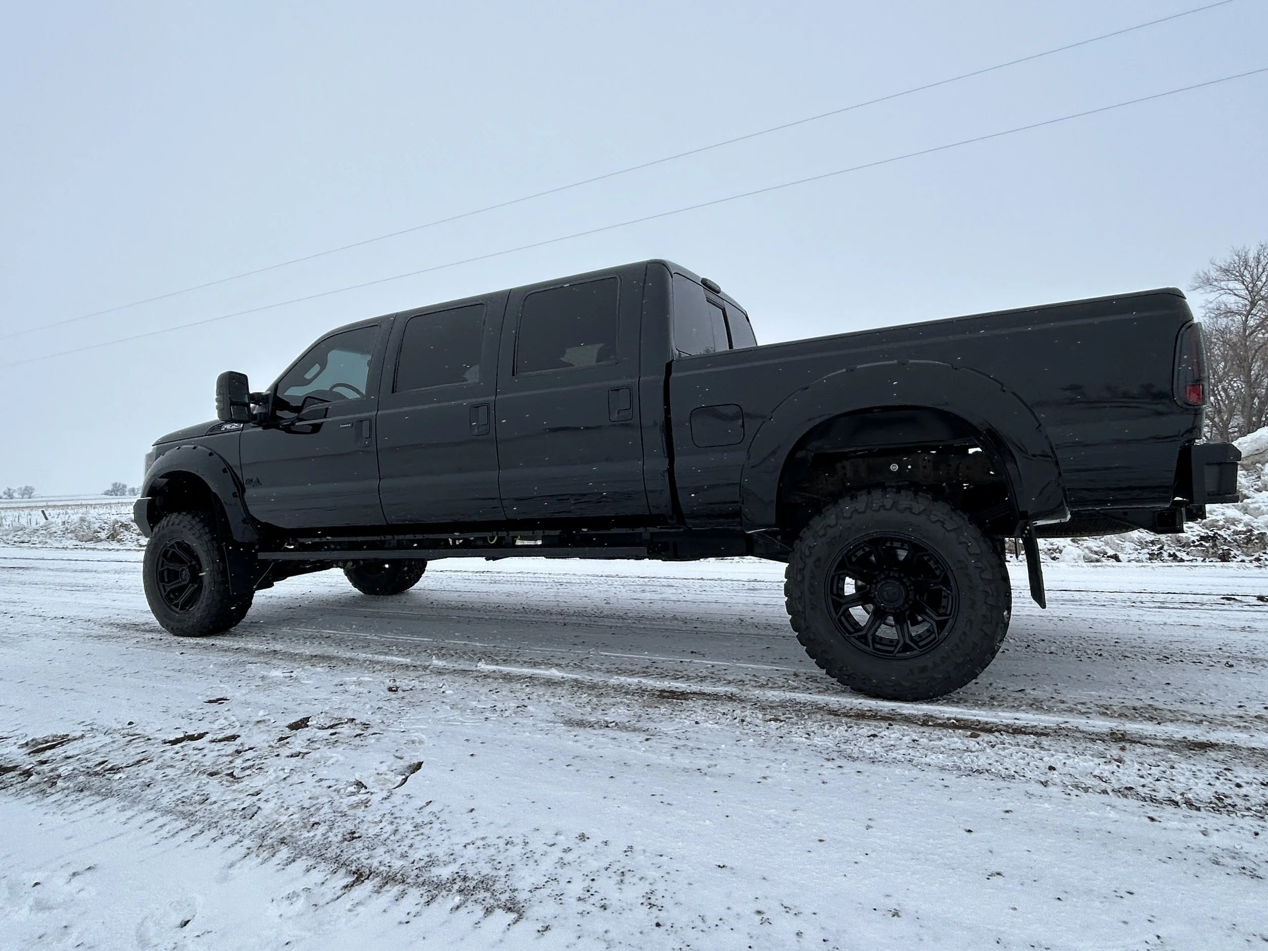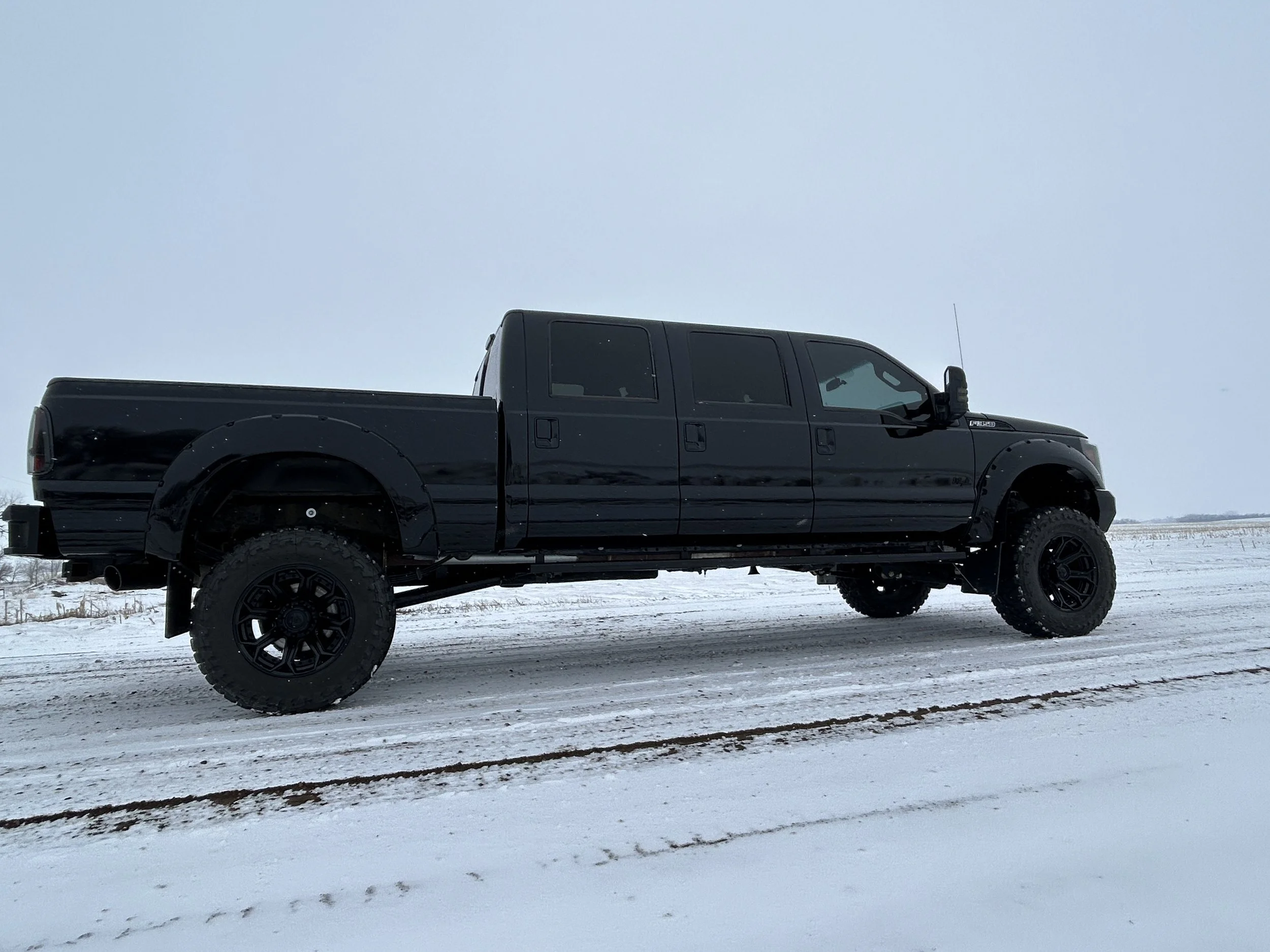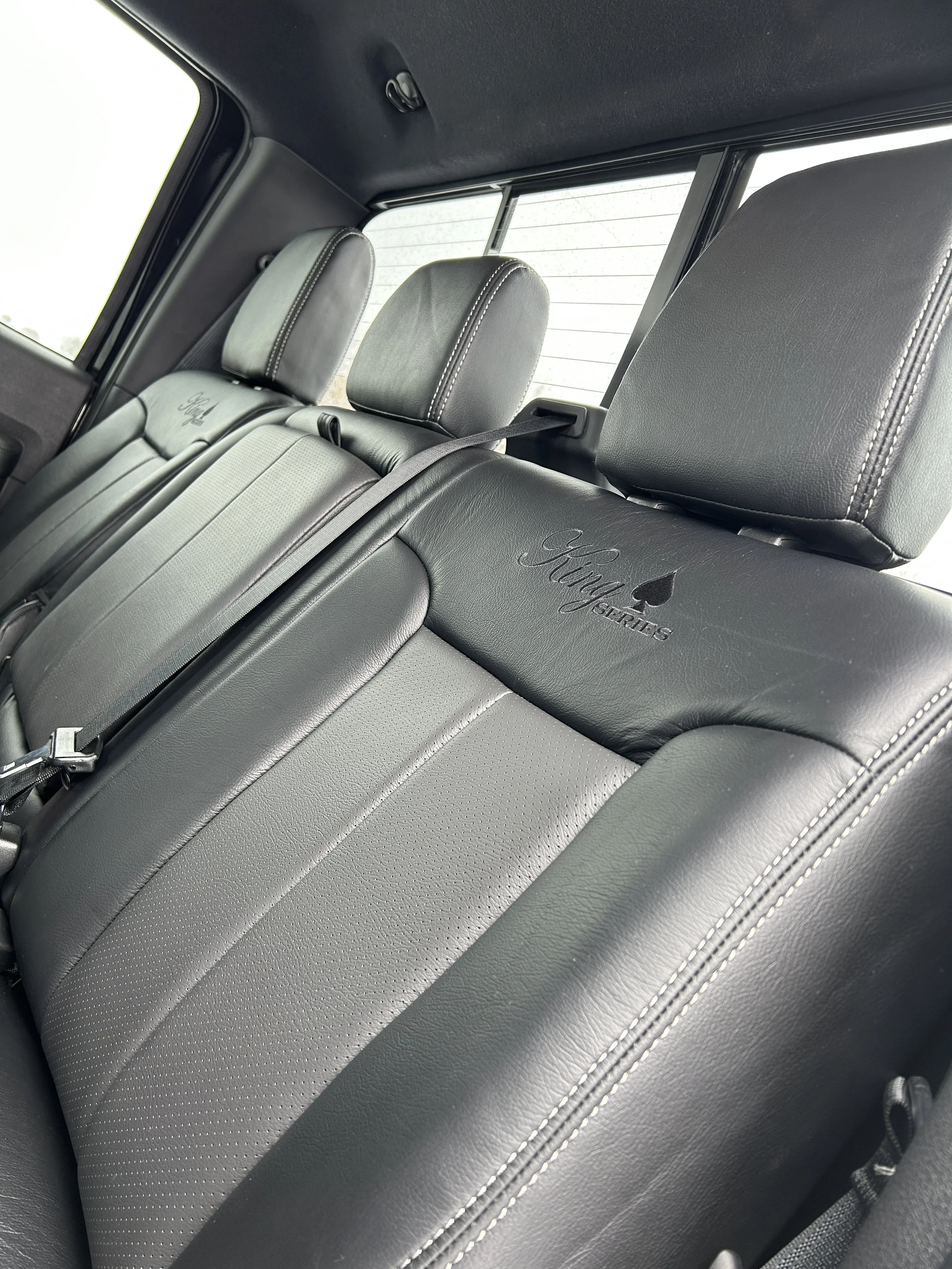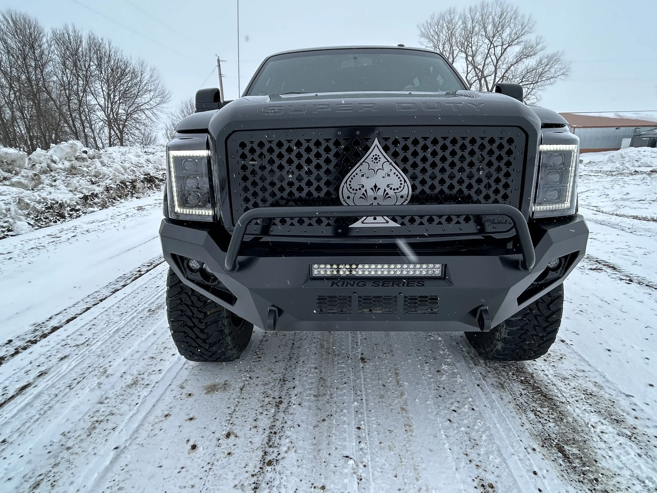 A photoshoot on a snowy day seems fitting for this truck, which is headed back home up north! Oil industry to kids’ hockey games, this truck is all-purpose - equipped with an additional auxiliary heating system and heated seats throughout, this truck will stay warm in the harsh winters. A Shadow Black, Platinum trim level truck, the client changed from chrome/brushed accents to a blacked out look on the exterior, which continues to the interior by showcasing a Black wrap with Dark Graphite combo and a Frost stitch custom Katzkin leather upholstery. This customer provided truck came to us with a 6” lift along with custom wheels and 37” tires, so the added length from the conversion makes the stance even more profound! This truck features a custom Spade grille insert from our new King Series custom accessory line along with a 56 gallon replacement fuel tank from S & B tanks, a Kleinn Train Horn, Vision X LED bed lighting, Vision X LED running board lights, and interior floor lighting. He’s added all smoked lighting to the exterior and a shop favorite, Jimmi Jammers, for extra security! Standard features include: LizardSkin spray-on Ceramic Insulation and Sound Control. Dual port USB sockets. Mil-Spec Liner in the box. Air Lift air helper springs with in-cab controls. Bilstein B8 shock absorbers. 2 Interstate Batteries. Factory Ford Puck 5th Wheel Hitch. Seats 8. 4x4. 6.7L diesel. Warranty included. Top notch conversion with seamless fabrication! Learn more and see our other conversions at www.kingseriespickup.com. Contact us today at 605-550-9002 or at kingseriespickup@gmail.com to inquire! You can also contact us below on the link!