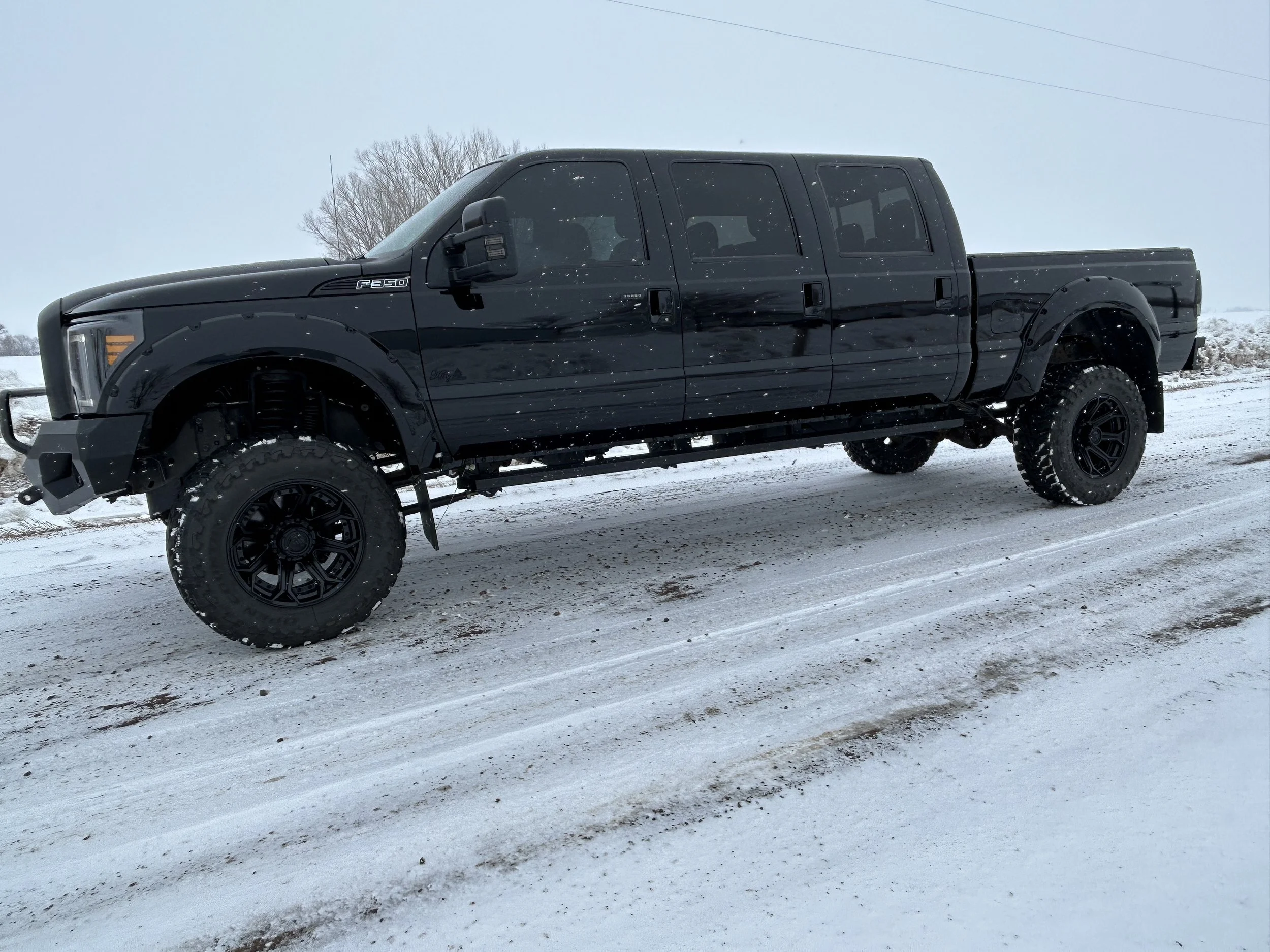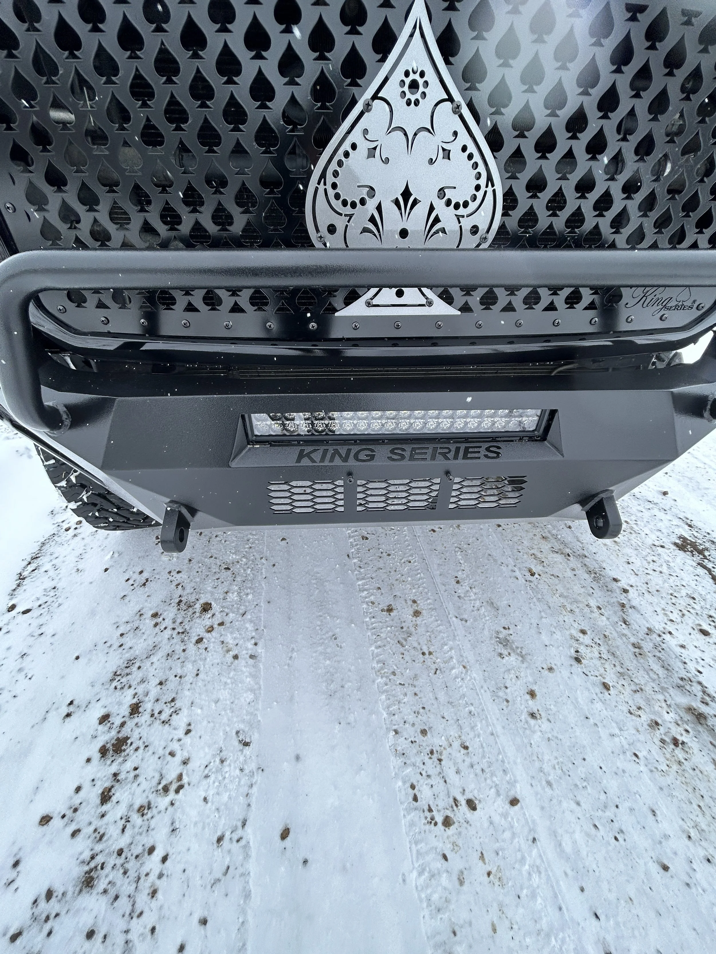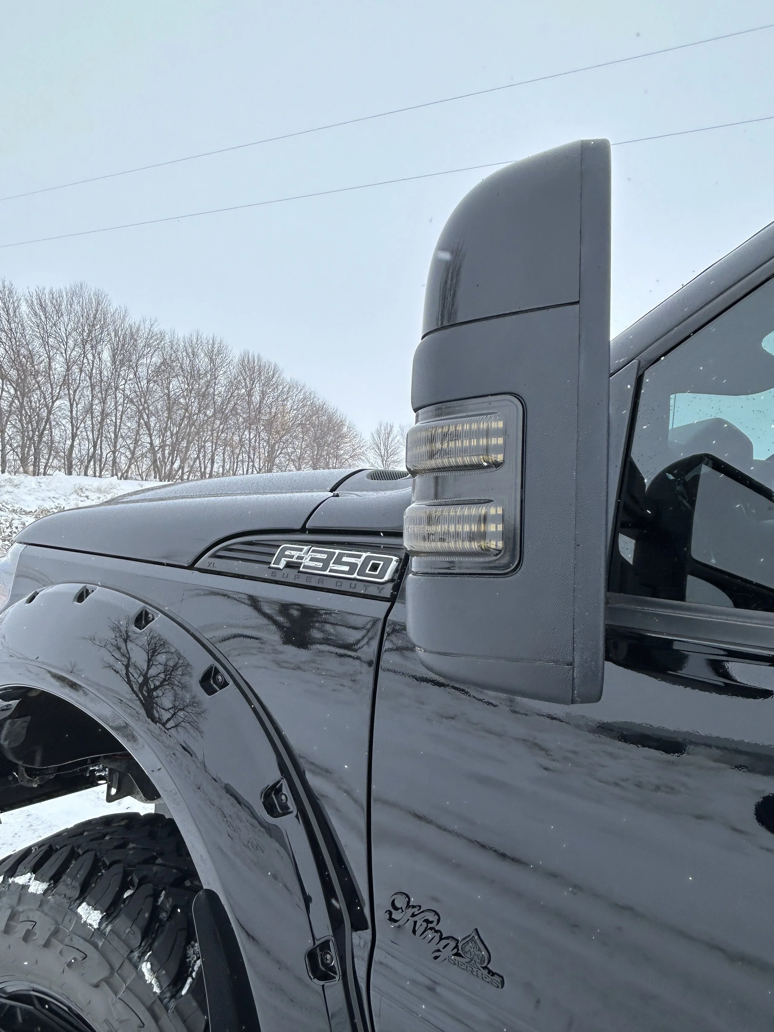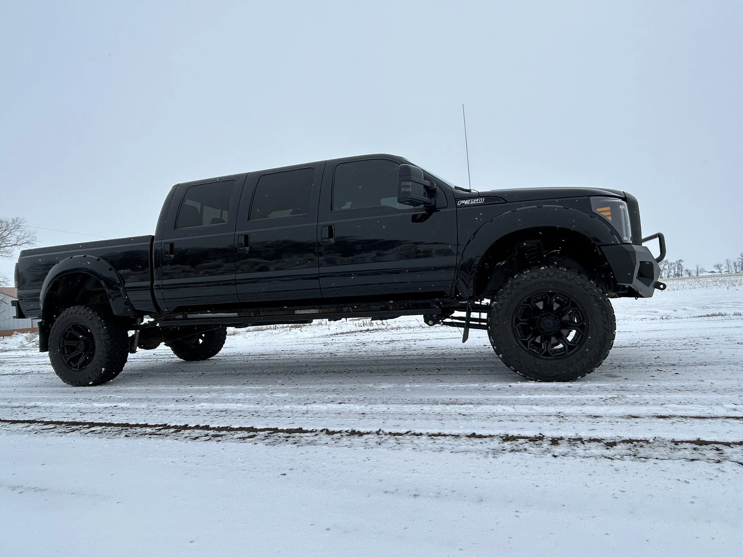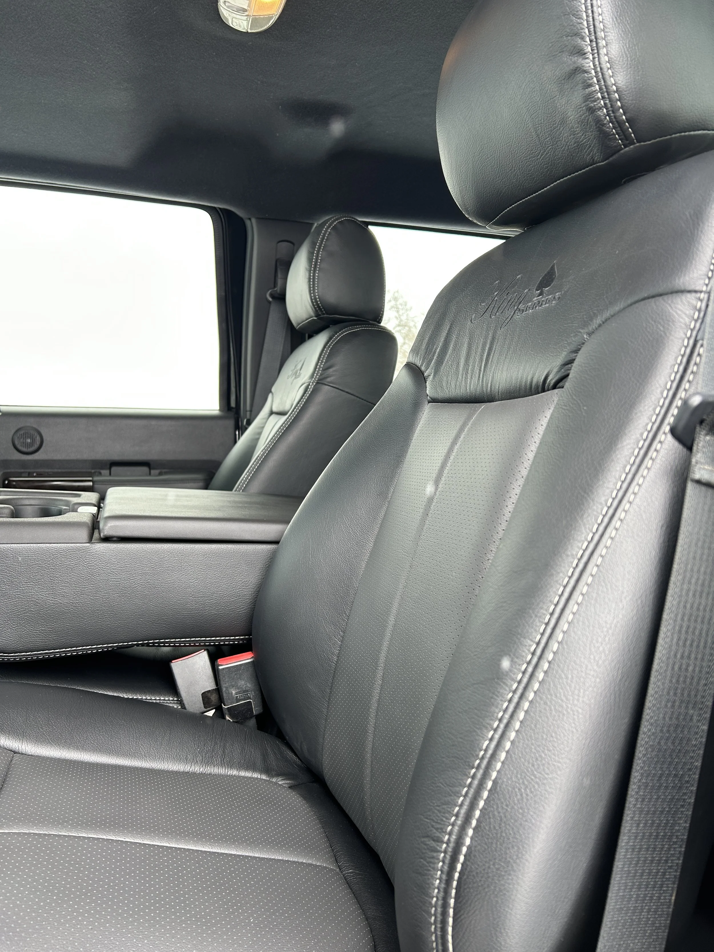 A photoshoot on a snowy day seems fitting for this truck, which is headed back home up north! Oil industry to kids’ hockey games, this truck is all-purpose - equipped with an additional auxiliary heating system and heated seats throughout, this truck will stay warm in the harsh winters. A Shadow Black, Platinum trim level truck, the client changed from chrome/brushed accents to a blacked out look on the exterior, which continues to the interior by showcasing a Black wrap with Dark Graphite combo and a Frost stitch custom Katzkin leather upholstery. This customer provided truck came to us with a 6” lift along with custom wheels and 37” tires, so the added length from the conversion makes the stance even more profound! This truck features a custom Spade grille insert from our new King Series custom accessory line along with a 56 gallon replacement fuel tank from S & B tanks, a Kleinn Train Horn, Vision X LED bed lighting, Vision X LED running board lights, and interior floor lighting. He’s added all smoked lighting to the exterior and a shop favorite, Jimmi Jammers, for extra security! Standard features include: LizardSkin spray-on Ceramic Insulation and Sound Control. Dual port USB sockets. Mil-Spec Liner in the box. Air Lift air helper springs with in-cab controls. Bilstein B8 shock absorbers. 2 Interstate Batteries. Factory Ford Puck 5th Wheel Hitch. Seats 8. 4x4. 6.7L diesel. Warranty included. Top notch conversion with seamless fabrication! Learn more and see our other conversions at www.kingseriespickup.com. Contact us today at 605-550-9002 or at kingseriespickup@gmail.com to inquire! You can also contact us below on the link!