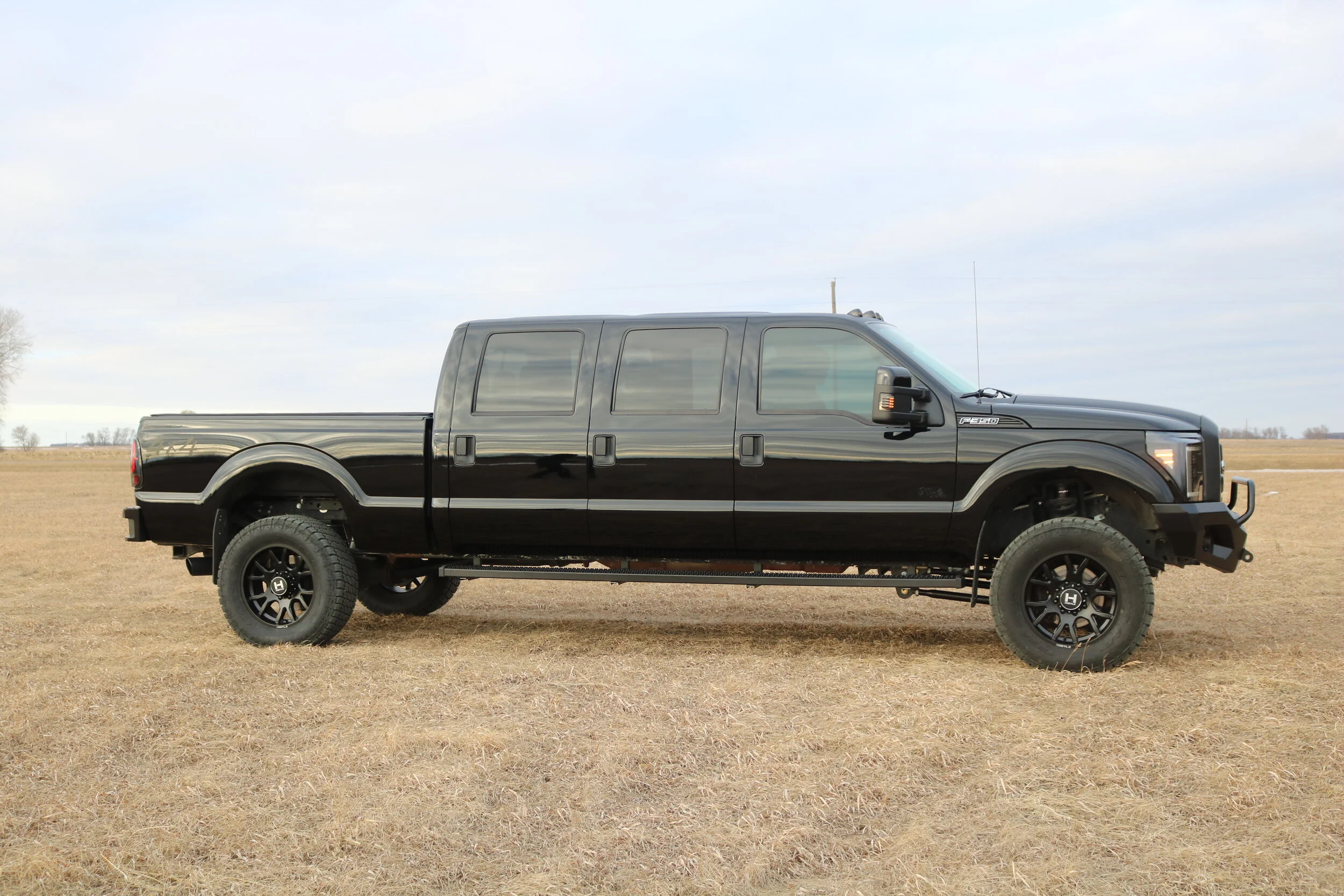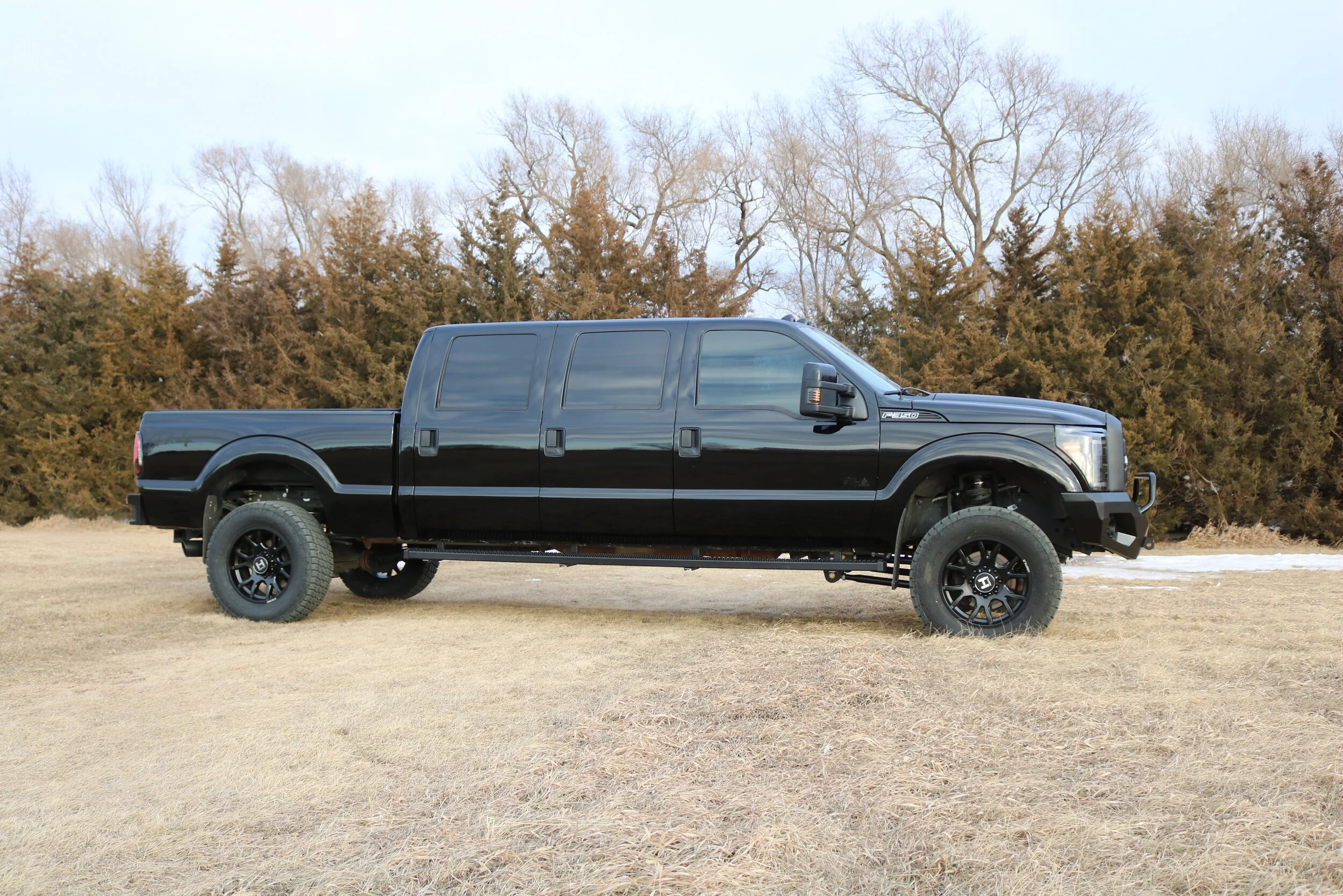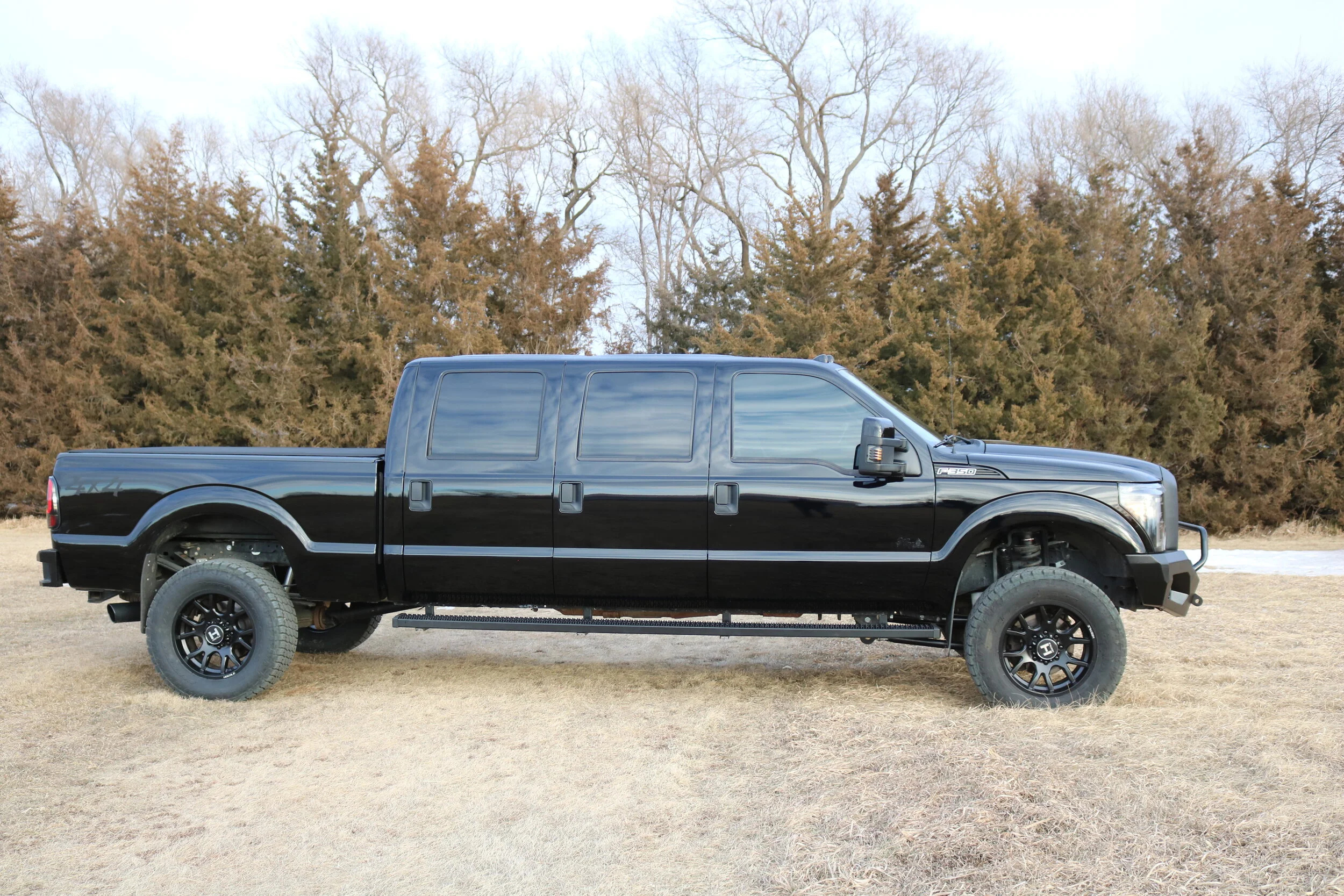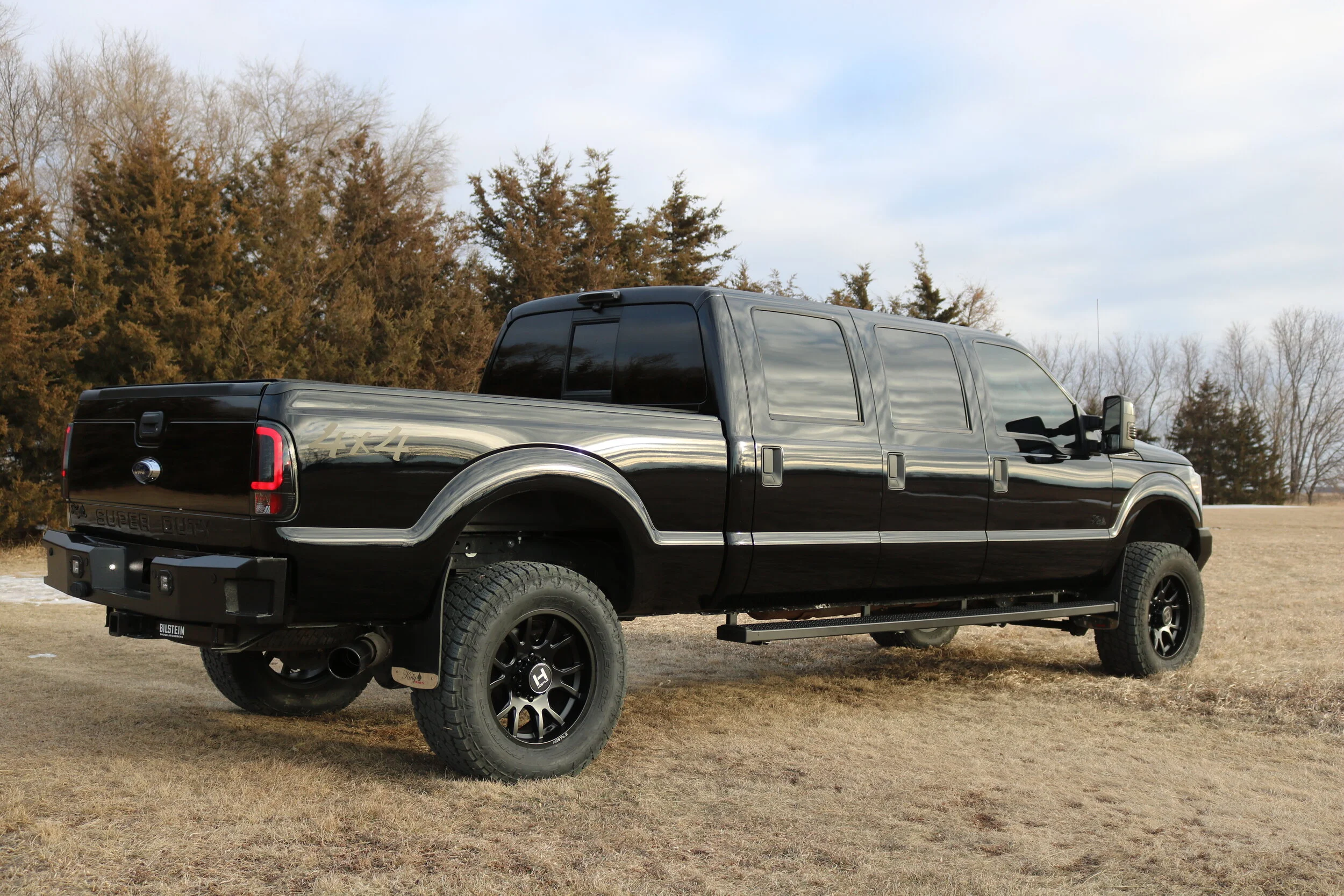 This Blizzard of Oz Pearl White exterior paired with a Black and Barracuda Charcoal two-tone combo interior custom Katzkin leather upholstery makes for a clean look. Newly featured in this truck are custom hydro-dipped carbon fiber accents. With a 145-gallon fuel capacity, this truck can nearly travel from California to New York before a fill-up with the Titan 65 gallon fuel tank, Titan 30 gallon innovative spare tire auxillary fuel system, and the Titan Travel Trekker. Heated and Cooled seats and dual flip down roof DVD systems make for a fun and comfortable ride. Other options and upgrades include: LizardSkin spray-on Ceramic Insulation and Sound Control. Luverne Mud Flaps. Luverne Running Boards. Dual port USB sockets. Camera Source 3rd Brake Light Camera. Firestone Ride-Rite air helper springs with in-cab controls and additional Firestone Coil-Rite front air springs. Bilstein B8 shock absorbers. Fuel Maverick wheels. Nitto Ridge Grappler tires. Set of 6 Door Striker for silent door closures. 2 Interstate Batteries. Husky Floorliners. Seats 7. 4x4. 6.7L diesel. 8’ box. Top notch conversion with seamless fabrication! Learn more and see our other conversions at www.kingseriespickup.com. Contact us today at 605-550-9002 or at kingseriespickup@gmail.com to inquire! You can also contact us below on the link!